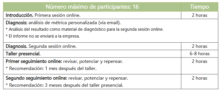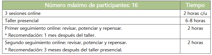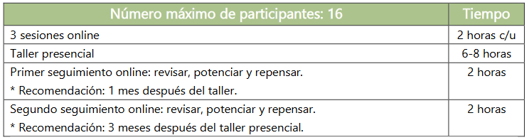 La duración del taller dependerá de los objetivos específicos, el número de participantes, las dinámicas, las actividades de “debriefing” después de las dinámicas y el plan de acción de cada caso particular.